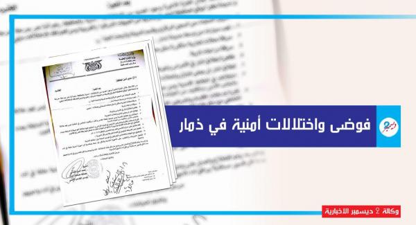 تزايدت الفوضى والاختلالات الأمنية بمختلف أشكالها في محافظة ذمار منذ سيطرة مليشيا الحوثي عليها. وكشفت وثيقة صادرة بتاريخ الخميس 28 يونيو 2018 - حصلت وكالة