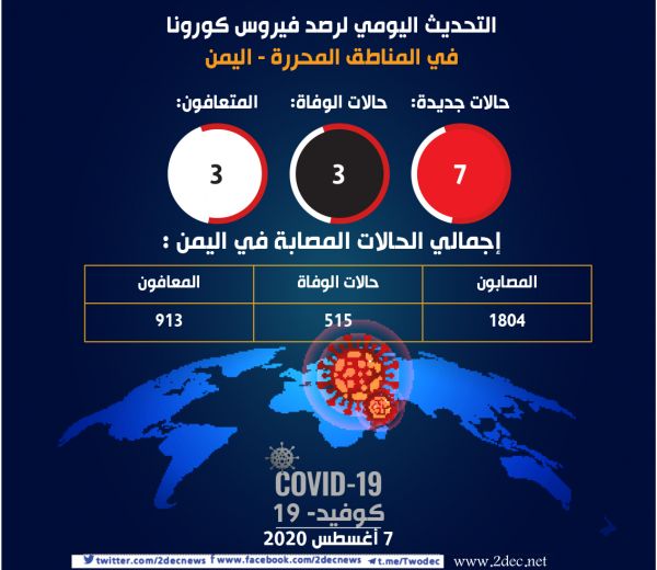 سجلت وزارة الصحة العامة والسكان، اليوم الأحد، 7 إصابات جديدة بفيروس كورونا المستجد، اقتصرت على محافظتي تعز وحضرموت. وقالت اللجنة الوطنية لمواجهة فيروس كورونا، التابعة
