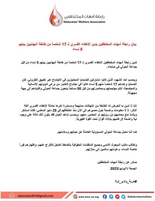 طالبت رابطة أمهات المختطفين، بضغط أممي على مليشيا الحوثي، لإطلاق سراح 17 من أتباع الطائفة البهائية، بينهم خمس نساء. وقالت الرابطة الحقوقية في بيان: "ندين
