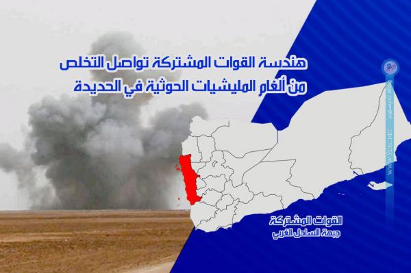 تواصل فرق الهندسة في القوات المشتركة التخلص من الألغام والعبوات الناسفة التي زرعتها المليشيات الحوثية في مناطق وأحياء سكنية بمدينة الحديدة قبل دحرها منها. وأوضح