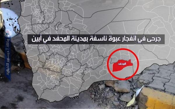 أفادت مصادر متطابقة بسقط جرحى مدنيين ،اليوم الأحد 24 مارس 2019م ،اثر انفجار عبوة ناسفة بمدينة المحفد بمحافظة أبين جنوبي اليمن . وقالت المصادر ان