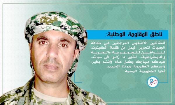 هنأ الناطق الرسمي باسم قوات المقاومة الوطنية حراس الجمهورية العقيد ركن صادق دويد، الجنود المرابطين في كافة جبهات تحرير اليمن من ظلمة الكهنوت بمناسبة حلول عيد