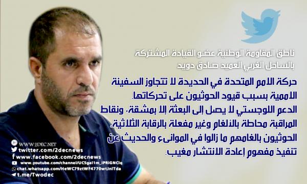 قال العميد صادق دويد ناطق المقاومة الوطنية، عضو قيادة القوات المشتركة في الساحل الغربي اليمني، إن مليشيا الحوثي قيدت تحركات الأمم المتحدة في محافظة الحديدة،وجمدت مراقبة