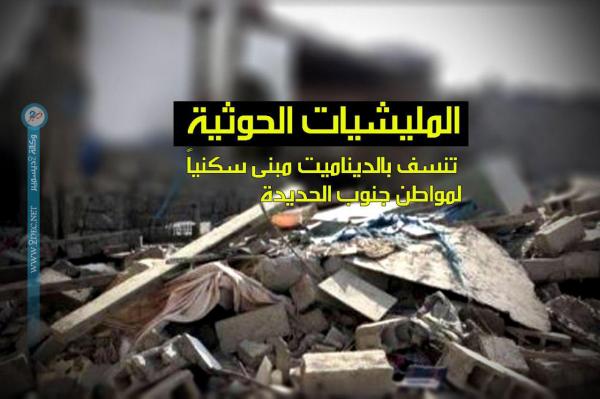 أقدمت المليشيات الحوثية اليوم الجمعة، على تفخيخ ونسف مبنى سكني لمواطن جنوب الحديدة ضمن جرائمها المتواصلة بحق المدنيين وتهديد أمنهم وسلامتهم وإجبارهم على النزوح. وأفاد