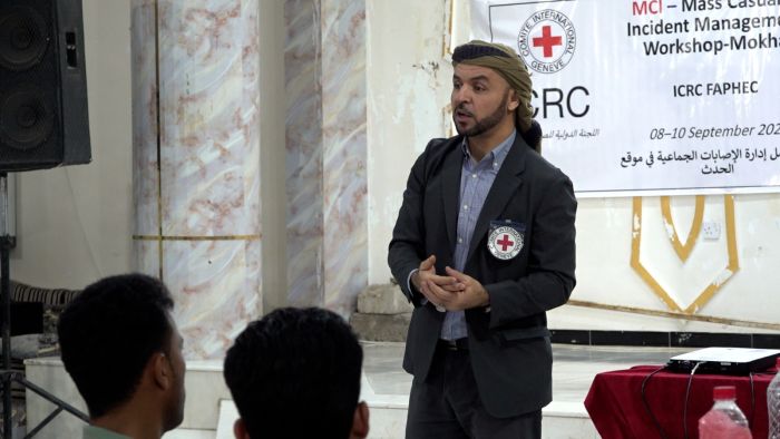 دشنت اللجنة الدولية للصليب الأحمر، الاثنين، بمدينة المخا، ورشة تدريبية حول إدارة الإصابات الجماعية في موقع الحدث، بحضور مدير مكتب شؤون المنظمات في الساحل الغربي الدكتور