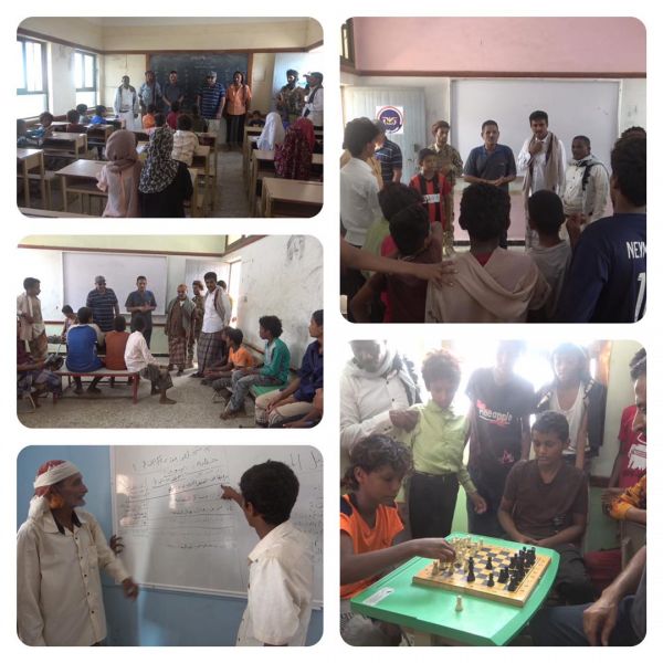 نظم طلاب المركز الصيفي بمدرسة 22 مايو في منطقة "السويهرة" مديرية مقبنة، غربي تعز، حملة لإزالة الشعارات التي طبعتها مليشيات الحوثي على الجدران والحوائط في