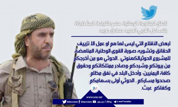 دعا ناطق المقاومة الوطنية عضو القيادة المشتركة بالساحل الغربي العميد الركن صادق دويد، مساء اليوم الأربعاء، إلى تصحيح مسار الأقلام وتوجيه السهام إلى الحوثي الذي أدخل