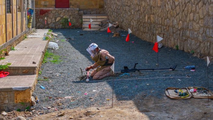 نفّذ مشروع "مسام" لنزع الألغام في اليمن، عملية تأمين شاملة لمجمع حكومي في مديرية صالة بمحافظة تعز، عقب اكتشاف لغم فردي داخل حوش المبنى، كان يشكّل
