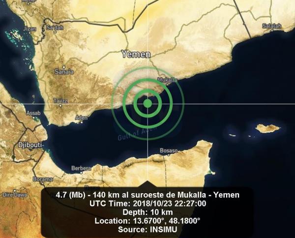 أفاد المركز الأوروبي للرصد الزلزالي بحدوث هزة أرضية في الساعات الأولى من فجر اليوم الأربعاء 24 أكتوبر 2018، بالقرب من السواحل الشرقية لليمن. وذكر المركز