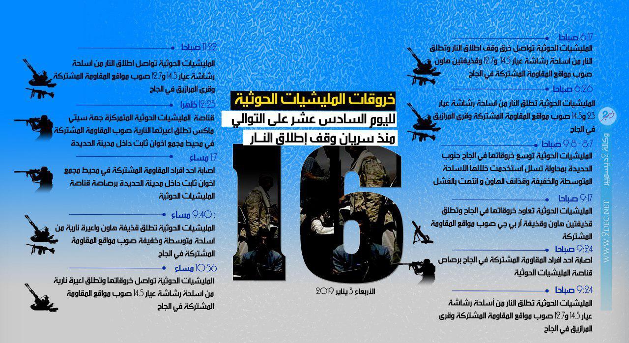واصلت مليشيا الحوثي خروقاتها لوقف إطلاق النار في الحديدة لليوم السادس عشر على التوالي من بدء سريانه، بالتزامن مع استئناف اللجنة الثلاثية المشتركة لإعادة الانتشار في
