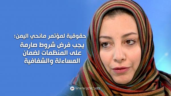 حقوقية يمنية لمؤتمر مانحي اليمن: يجب فرض شروط صارمة على المنظمات لضمان المساءلة والشفافية طالبت حقوقية يمنية الدول المانحة المشاركة في مؤتمر المانحين بالسعودية بفرض