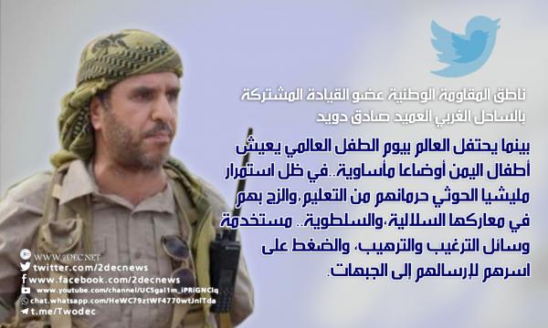 لفت ضابط كبير في المقاومة الوطنية، خلال تغريدة له، مساء اليوم الأربعاء، على "تويتر" إلى مأساة الأطفال اليمنيين، بمناطق سيطرة المليشيا الحوثية، وذلك بمناسبة يوم الطفل