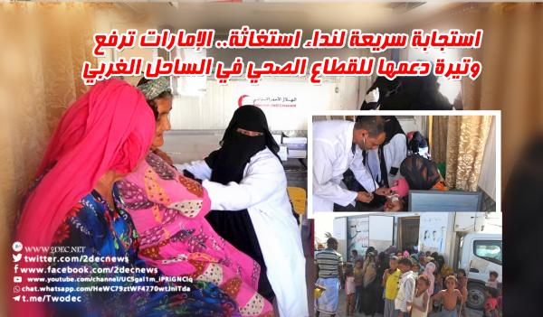 رفعت دولة الإمارات العربية المتحدة عبر ذراعها الإنسانية هيئة الهلال الأحمر وتيرة دعمها للقطاع الصحي في الساحل الغربي اليمني تلبية لنداء استغاثة من الجهات المختصة لمواجهة
