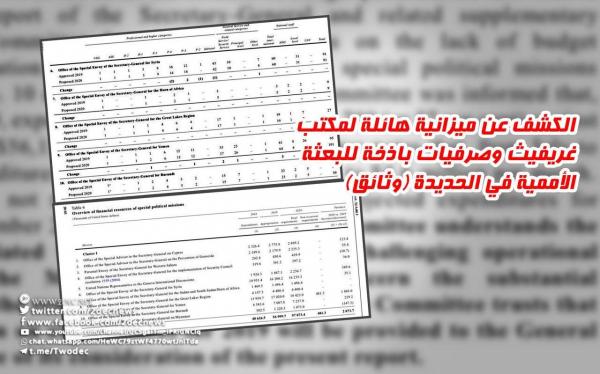 كشفت معلومات وبيانات رسمية عن ميزانية مكتب مبعوث الأمم المتحدة إلى اليمن مارتن غريفيث ومكتبة والبعثة الأممية في الحديدة؛ تظهر حجم الأموال المرصودة والصرفيات الباذخة للموظفين