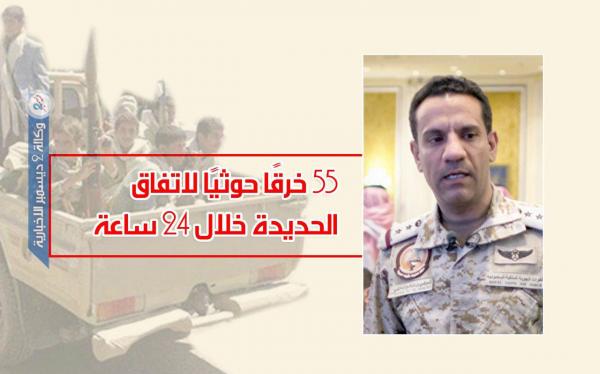 أعلن التحالف العربي في اليمن عن رصد 55 خرقًا من الميليشيات الحوثية لوقف إطلاق النار بالحديدة، خلال الـ24 ساعة الماضية . وأضاف التحالف ،السبت، أن