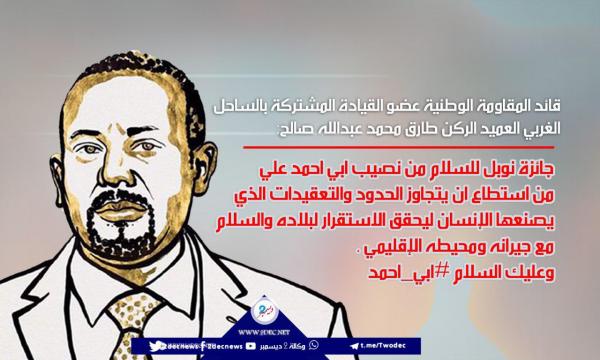 أشاد قائد المقاومة الوطنية عضو القيادة المشتركة بالساحل الغربي بحصول رئيس الوزراء الإثيوبي آبي أحمد على جائزة نوبل للسلام لهذا العام. وقال العميد طارق صالح