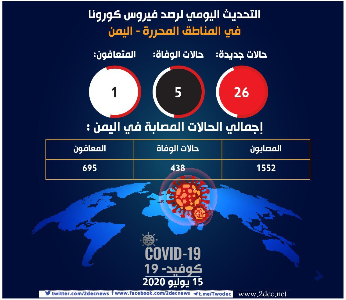 سجلت وزارة الصحة اليمنية 26 حالة إصابة جديدة بفيروس كورونا و(5) وفيات بالفيروس خلال الساعات الماضية في المحافظات اليمنية المحررة. وفي التفاصيل التي أوردتها اللجنة