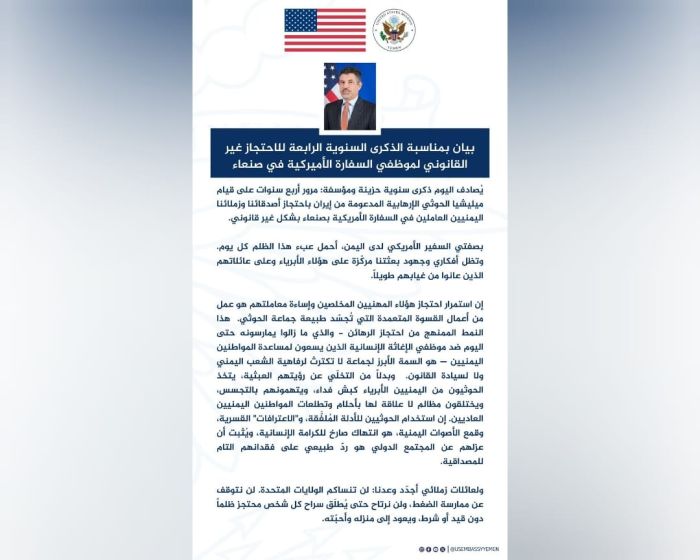 جدّد السفير الأمريكي لدى اليمن، ستيفن فاجن، التنديد باحتجاز مليشيا الحوثي الإرهابية- المدعومة من إيران- لموظفي السفارة في صنعاء منذ أربع سنوات، مؤكدًا أن استمرار هذا